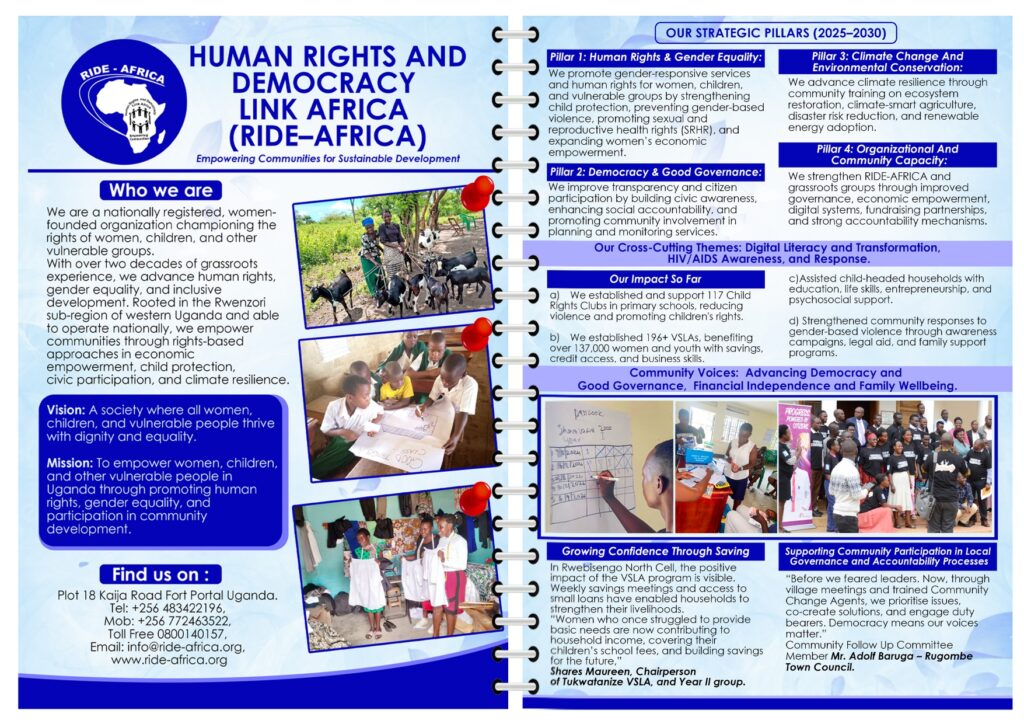 Human Rights and Democracy Link Africa (RIDE-AFRICA) is a women-founded and women-led grassroots organization advancing human rights, gender equality, and social justice in the Tooro sub-region and across Uganda.
